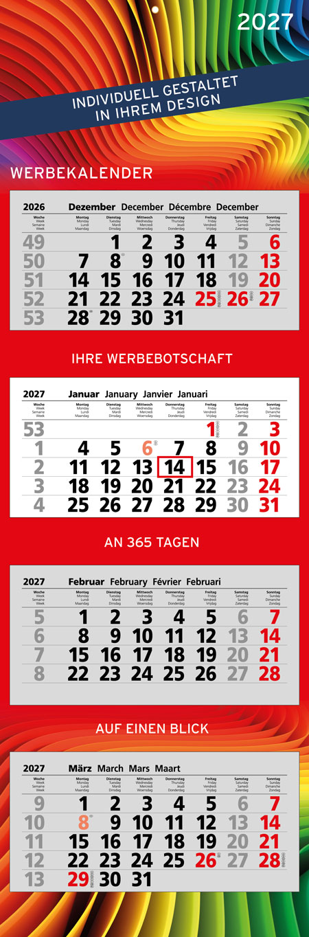 Eines der beliebtesten Werbemittel im Büroalltag. Ob als Geschenk für Ihre Kunden, Geschäftspartner und Lieferanten oder für den internen Gebrauch, mit einem individuellen 4-Monatskalender bleiben Sie mit Ihrem Unternehmen stets präsent. Ihre Werbebotschaft ist das ganze Jahr sichtbar! Mit einem 4-Monatskalender haben Sie 4 Monate des Jahres komplett auf einem Blick. Eine einfachere und übersichtlichere Terminplanung ist möglich. Mit dem vormontierten Datumschieber können Sie den aktuellen Tag markieren.